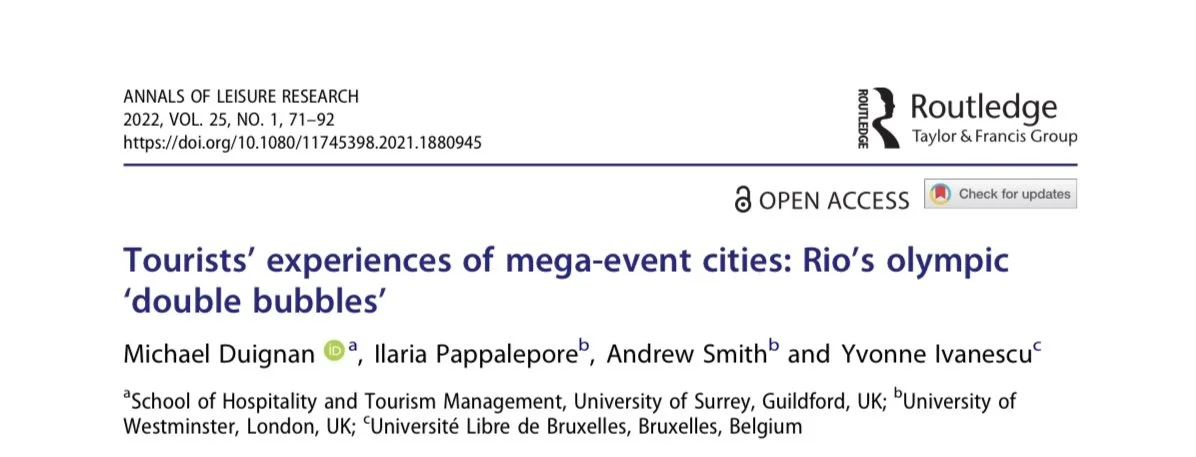 Rio 2016 sought to connect Olympic-tourists with the city’s local- Cariocan community and culture. Yet the way mega-events are spatially and regulatorily organized, alongside the behavioural tendencies of Olympic-tourists, constrain such ambitions. Using Rio 2016 as a case-study, we offer in-depth, qualitative insights through the lens of 35 individual Olympic-tourists to examine how and why these factors determine behaviour, and thus experiences across host-environments. We detail how concerns over tourists’ safety result in managers designing risk averse experiences, produced by overlaying hyper-securitized and regulatory enforcements inside existing tourist bubbles, creating what we refer to as a ‘double bubble’ – reducing the likelihood of visitors venturing ‘off-the-beaten-track’. Whilst Olympic-bubbles protect tourists from outside threats, they restrict cultural engagement with the wider city, neighbourhoods and locals –side-lining other sides to Rio. We suggest managers adopt a dual- strategy of ‘local infusion’ in and ‘tourist diffusion’ beyond official zones to achieve intended goals.
