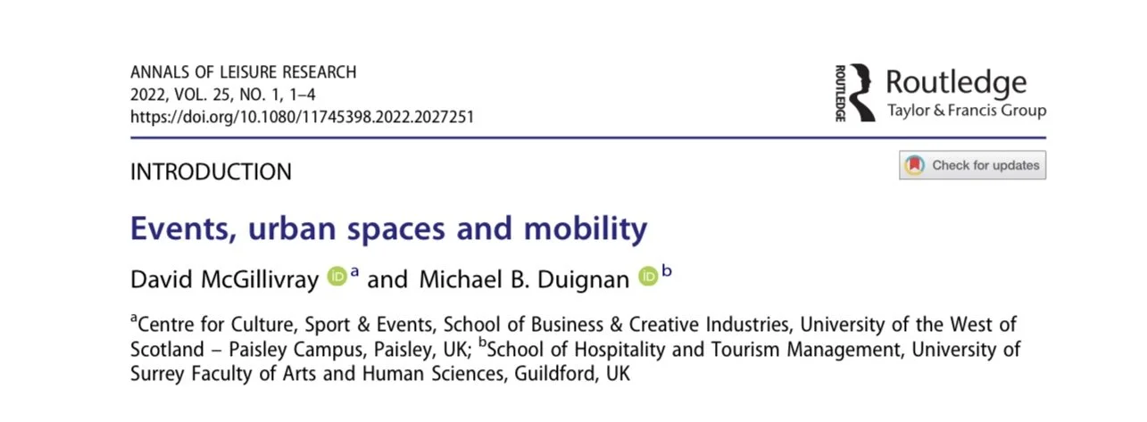 This special issue seeks to critically examine the relationship between events, urban spaces and mobility. Specifically, it seeks to explore how and why events enable and/or produce new spatial (re)configurations when staged and how these changes influence mobility, exploration, engagement and/or consumption across host environments – whether at an international, national, regional, city and/or community level. Events, irrespective of their size and composition, influence the way people move, explore, engage with and/or consume the urban environments that stage them (Giulianotti et al. 2015; Mhanna, Blake, and Jones 2017). They are often managed in private venues, yet are increasingly staged in public spaces like street, squares and parks (Smith 2016). Utilizing urban public spaces to house events, whether a beach, park or plaza, often requires temporary urban rearrangements, producing what are sometimes referred to as ‘Host Event Zones’ (HEZs). These are temporary designated areas where event acti- vation activities take place (McGillivray, Duignan, and Mielke 2020). Sometimes HEZs are public and open to all, other times they are private and closed, requiring a ticket to access and the rights of sponsors and other commercial actors being protected by excep- tional planning regulations. Beyond the demarcated boundaries of HEZs, events also extend their territorial presence and reach in a number of creative ways, including the emergence of ‘fringe spaces’. For example, food festivals have sought to engage periph- erally located restaurants as a way to move visitors out of central urban areas (Duignan et al. 2017). In contrast, mega sport event organizers create strategically located ‘live sites’ and ‘fan parks’ to house non-sporting cultural and commercial activity, deploying tactics to circulate visitors to and contain them within global spaces of consumption (Armstrong, Giulianotti, and Hobbs 2017).