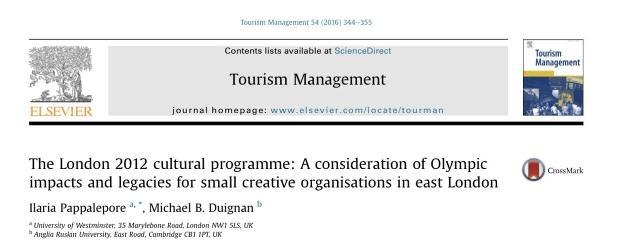This study investigates the impacts of the London 2012 Olympic Games and their related cultural pro- gramme on local small creative organisations in East London. It contributes to unpacking the elusive concept of legacy thorough an in-depth analysis of creative organisations' stories and experiences, combined with an analysis of policy documents and interviews with key informants, over a four-year period (2010e2014). A range of potential impacts of mega-events for creative organisations are identi- fied and systematically discussed. The results highlight a gap between Olympic rhetoric and local reality. Problems include inadequate local consultation, barriers to accessing opportunities and inability to leverage effectively. The study also explores the role of cultural tourism in delivering an Olympic legacy for the local creative industry. It finds that opportunities to showcase deprived e but creative e areas in East London, and foster the development of creative forms of tourism, were missed.