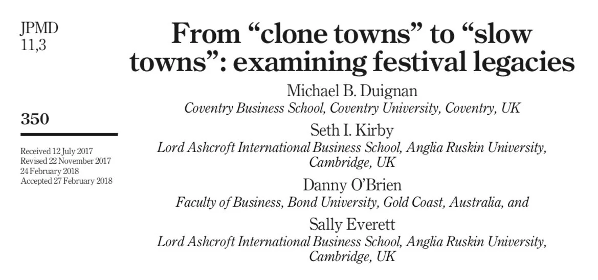 Originality/value – This study emphasises the importance of local bottom-up forms of “serendipitous leverage” for enhancing positive emergent “embryonic” legacies that advance “slow” tourism and local food agendas. In turn, this enhances the cultural offering and delivers longer-term sustainability for small local producers – particularly vital in the era of “Clone Town” threats and effects. The paper applies Chalip’s (2004) event leverage model to the empirical setting of EAT Cambridge and conceptually advances the framework by integrating “digital” forms of leverage.