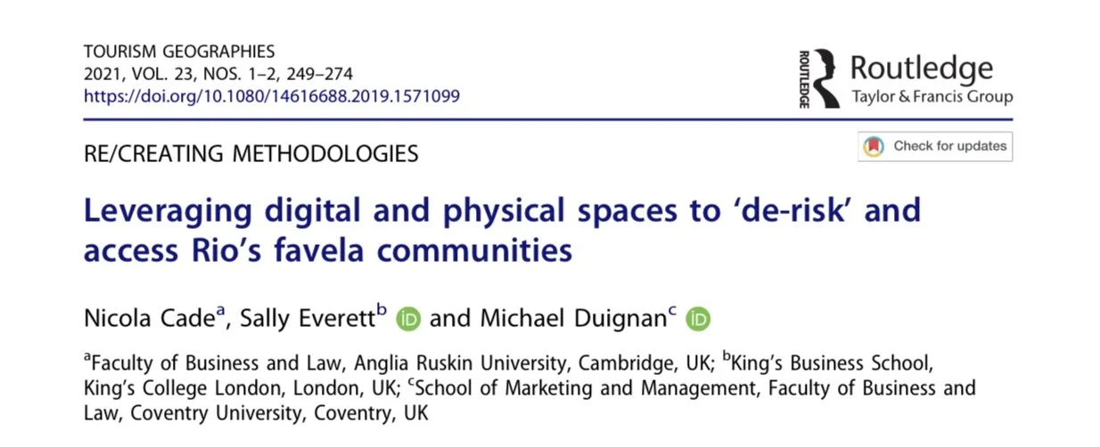 Building relationships of trust and mutual understanding between researcher(s), local stakeholder(s) and gatekeeper(s) is widely regarded as a critical factor in successful research. Methodological strategies and tactics are often based on contextual variability and accessing some communities presents a harder and riskier proposition than others. Here we propose an empirically driven and holistic methodological approach for accessing high-risk com- munities whereby deprivation and criminality characterises every- day living. Following the ‘legacy’ of both the 2014 FIFA World Cup and Rio 2016 Olympics, this paper charts a research journey by detailing how local perspectives were accessed at the heart of one urban favela in Rio: Morro dos Prazeres. The methodological framework is underpinned by leveraging social networks to aid the identification of key stakeholders required to access and bridge the void between researcher(s) and community. Furthermore, creative digital and physical access routes were also employed (including social messaging platforms such as ‘WhatsApp’) which helped build and maintain trust with highly respected community leaders before, during and after the research. We suggest that our pro- posed ‘Digi-cal model’ (reflecting the digital and physical nexus) approach is transferable to similar tourism projects that require sensitive approaches and complex stakeholder navigation in ‘high- risk’ community settings.