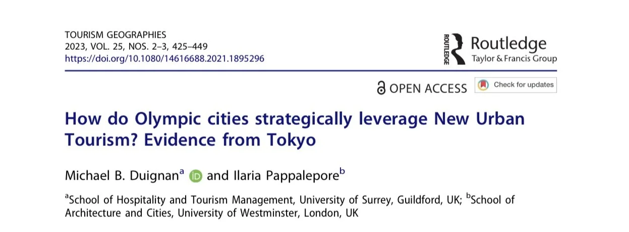 Olympic cities increasingly draw on New Urban Tourism (NUT) principles as part of a host’s strategic tourism development objec- tives. By doing so, governments and event organisers seek to entangle visitors with local urban, cultural and everyday life. Yet, empirical evidence generated across previous Olympic cities illus- trates how hosts often fail to encourage such host–guest inter- activity. This is a critical tourism geography and consumption issue repeatedly identified across host city contexts. To address the disconnect between inbound urban tourists and host com- munities, Tokyo 2020 explicitly placed NUT objectives at the heart of official bid and policy promises. On the basis of a 33-day walk- ing ethnography in Tokyo as well as 26 interviews and documen- tary analysis, our work details a set of strategically planned and creative NUT initiatives deployed by the public, private sector, and host community in the lead up to the Tokyo 2020 Games. Some of these include state-funded walking tours and city volun- teer guide networks; tourist boards promoting local-grassroots festivals; through to joint collaborations between local tourist boards and ‘Timeout’ to produce local guides – constituting a productive step forward for showcasing the local culture outside tourist bubbles. Furthermore, we illustrate how Tokyo’s urban landscape closely intertwines tourist bubbles with local neigh- bourhoods affording a potential balance between staged and spontaneous host–guest interaction. Our conclusions emphasise the conceptual, social, and economic implications for strategic planning and implementation of NUT in Olympic cities and its potential contribution to inclusive and sustainable development.
