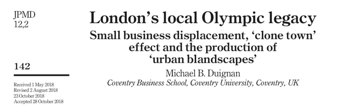 Originality/value – Examining event legacy, specifically local legacies forming across ex-host Olympic communities, is a latent, under-researched but vital and critical aspect of scholarship. Most event legacy analysis focuses on longer-term issues for residents, yet little research focuses on both local placed-based development challenges and small business sustainability and survival post-Games. More specifically, little research examines the potential relationship between event-led gentrification, associated rising rents and aforementioned clone town problematic. Revealing and amplifying the idiosyncratic local challenges generated through an in-depth empirically driven triangulation of key local business, policy, governmental and non-governmental perspectives, is a central contribution of this article missing from extant literatures. This paper considers different ways those responsible for event legacy, place managers and developers can combat such aforementioned post-Games challenges.