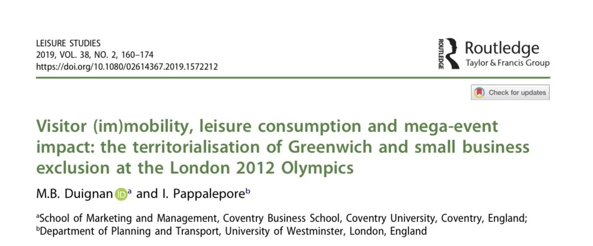 Focusing on the London 2012 Olympics, we investigate the impact of mega- sport events’ spatial transformations on visitor mobility, local leisure con- sumption and resulting small business trade. Our case study draws on 43 in-depth interviews with local authorities, governmental and non-govern- mental project actors, and small-local leisure and visitor economy businesses (retail and hospitality) located at the heart of a ‘Host Event Zone’ in Greenwich, London. We supplement subjective accounts with a documentary analysis of policy reports, media, and archival material as the basis for our empirical analysis. Our findings reveal a major dichotomy between the ‘rhetoric’ of inclusion and local ‘realities’ of exclusion as security planning and spatial controls served to close off public spaces and local attractions: diverting visitor flows and leisure consumption towards official event sites, away from local businesses. We illustrate how such urban processes effectively render a vibrant business community invisible and visitors immobile to explore local commu- nity spaces during the live staging periods. We close with implications for event organisers, managers and policymakers focused on re-configuring the socio-spatial elements of Olympic organisation and re-direct and mobilise visitor economy flows towards more open civic and leisure spaces in the hope of better (re)distributing consumption into host communities.