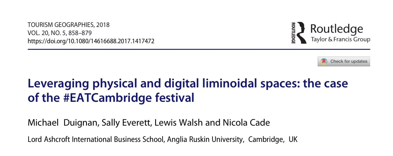 This paper conceptualises the way physical and digital spaces associated with festivals are being harnessed to create new spaces of consumption. It focuses on the ways local food businesses leverage opportunities in the tourist-historic city of Cambridge. Data from a survey of 28 food producers (in 2014) followed by 35 in- depth interviews at the EAT Cambridge food festival (in 2015) are used to explain how local producers overcome the challenges of physical peripherality and why they use social media to help support them challenges restrictive political and economic structures. We present a new conceptual framework which suggests the development of place through food festivals in heritage cities can be understood by pulling together the concepts of ‘event leveraging’, ‘liminoid spaces’ (physical and digital) and modes of ‘creative resistance’ which helps the survival of small producers against inner city gentrification and economically enforced peripherality.