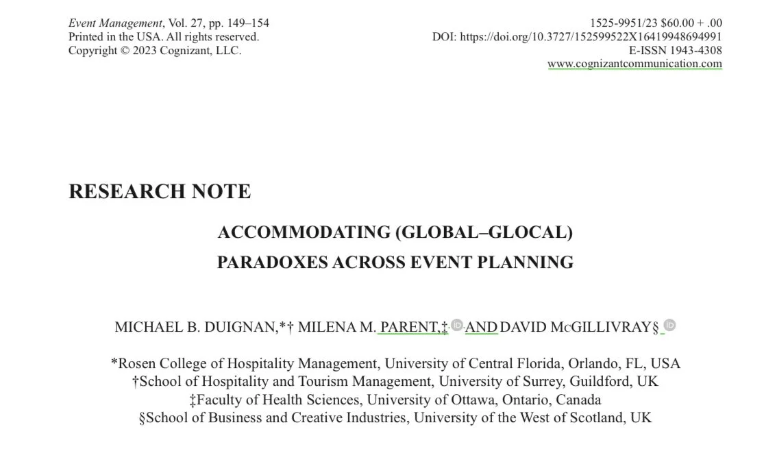 The aim of this research note is threefold: 1) to introduce the concept of paradox and its numerous applications to the study and management challenges associated with the planning and delivery of events, with a specific look at large-scale events like the Olympics to provide an extreme case; 2) to present a new paradox entitled the “Global–Glocal Paradox” that interrogates how inherent global and local stakeholder interests and tensions are managed; and 3) to present a series of conceptual and practical ways events can “accommodate” as opposed to “resolve” this paradox to help balance stakeholder interests instead of pitting one against the other.