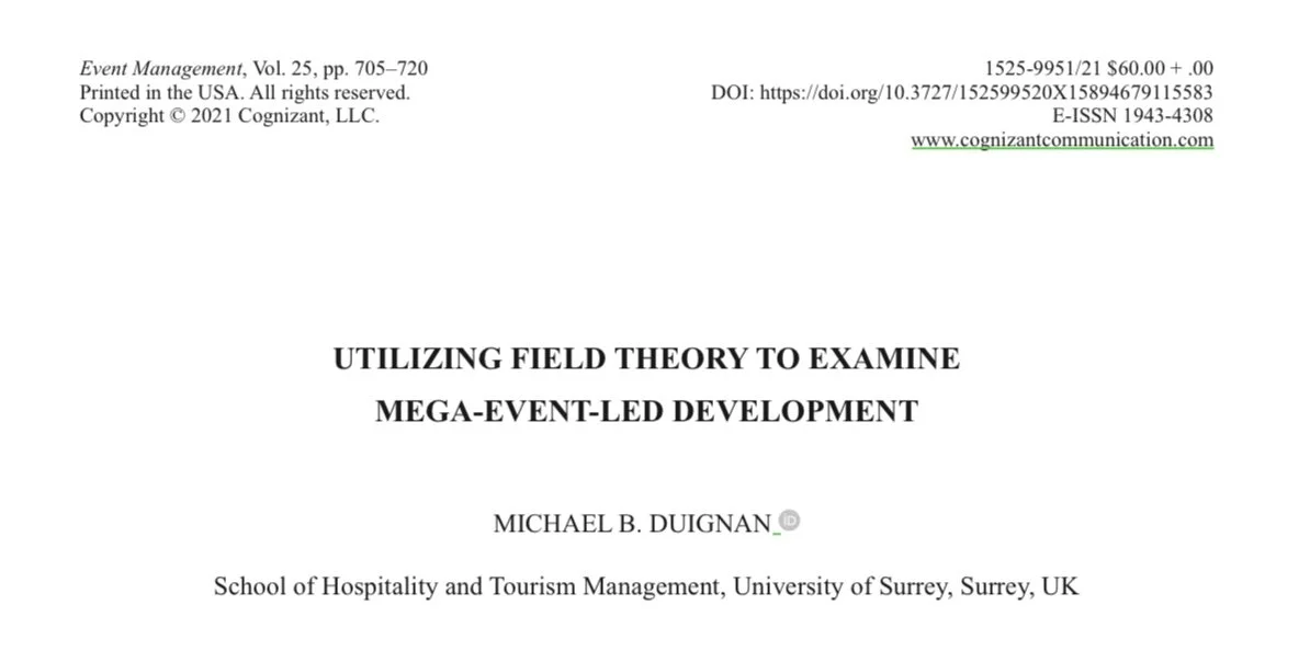 Scholars and practitioners have long been analyzing and evaluating the way events, particularly mega-events, serve as a mechanism of change. Powerful descriptions are typically brought to life via event impact and legacy case studies: yet, I argue such work can remain atheoretical—or—conceptu- ally disorganized. I draw on Bourdieu’s field theory and the management study of Field Configuring Events to develop a new analytical framework: the “Cognitive and Relational Mapping of Field Configuring Events”—offering a set of interrelated concepts to strengthen analysis and conceptual consistency between studies, while providing latitude to overlay different disciplinary perspectives. I detail methodological and conceptual advantages afforded alongside six ways the framework could be applied and extended across various cases and contexts.