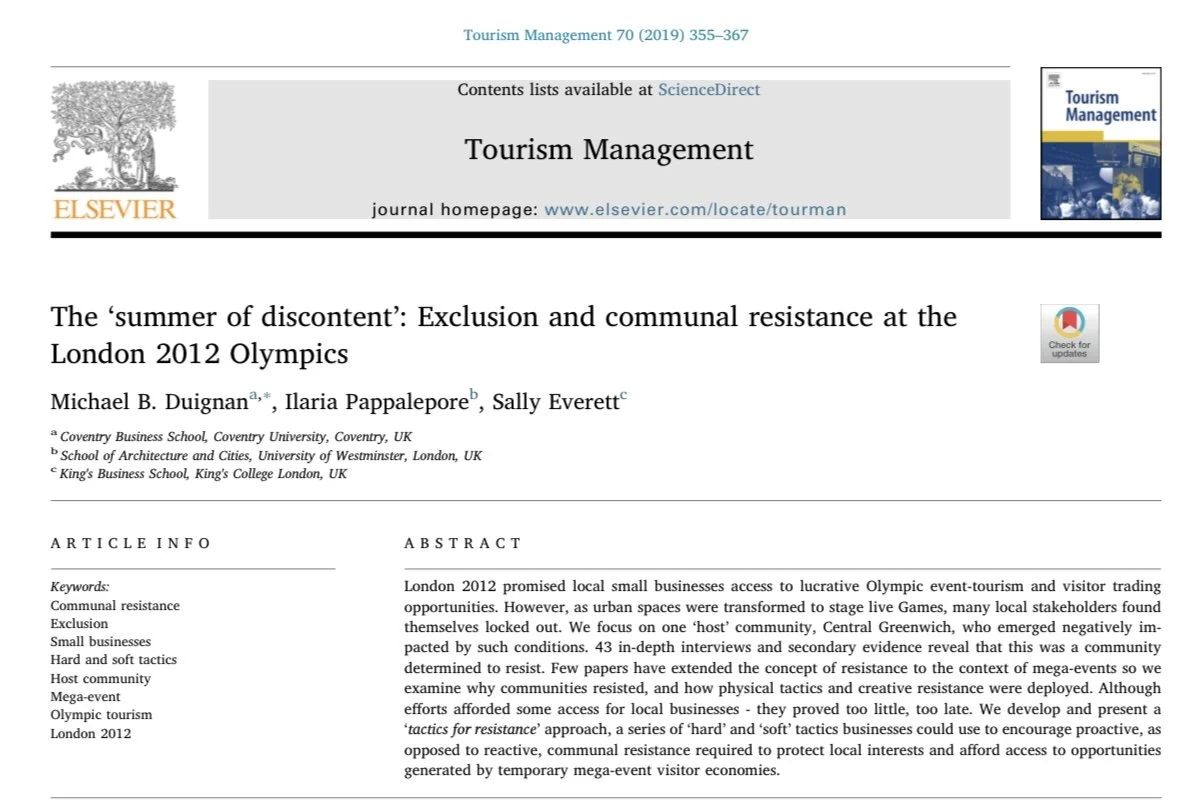 London 2012 promised local small businesses access to lucrative Olympic event-tourism and visitor trading opportunities. However, as urban spaces were transformed to stage live Games, many local stakeholders found themselves locked out. We focus on one ‘host’ community, Central Greenwich, who emerged negatively im- pacted by such conditions. 43 in-depth interviews and secondary evidence reveal that this was a community determined to resist. Few papers have extended the concept of resistance to the context of mega-events so we examine why communities resisted, and how physical tactics and creative resistance were deployed. Although efforts afforded some access for local businesses - they proved too little, too late. We develop and present a ‘tactics for resistance’ approach, a series of ‘hard’ and ‘soft’ tactics businesses could use to encourage proactive, as opposed to reactive, communal resistance required to protect local interests and afford access to opportunities generated by temporary mega-event visitor economies.