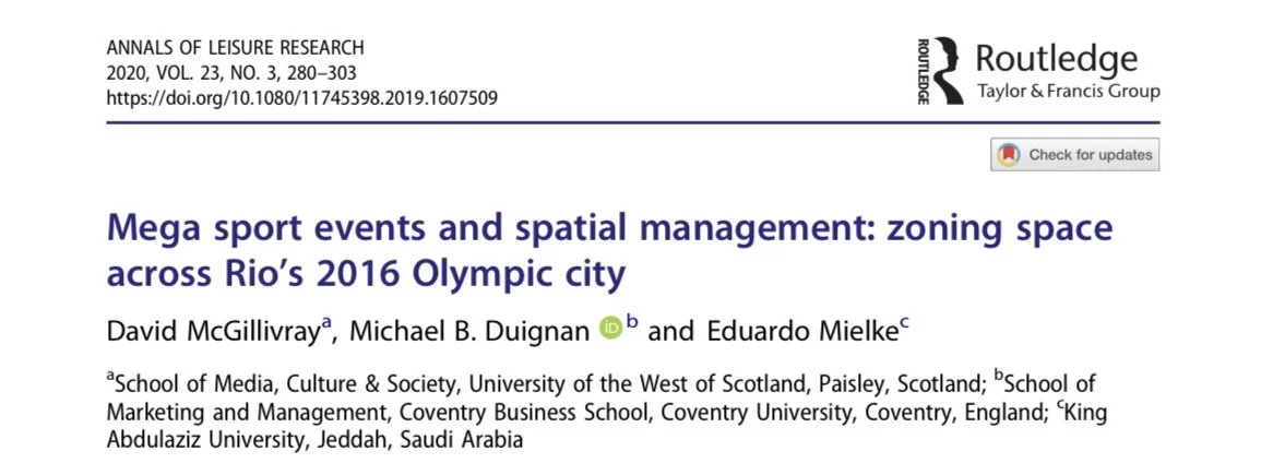 Hosting the Olympic Games demands the efficient and effective sequestration of public space across the city to stage official sports, cultural, and commercial activities. Specifically, this paper examines how fast-tracked urban development processes create exclusive, commercial enclaves to maximize leverageable benefits for external actors. We focus on the case of Rio 2016, drawing on: (i) observations across the city and event zones, including Live Site, Last Mile, and transit spaces, (ii) interviews with key event, policy and visitor economy stakeholders, (iii) documentary analysis of Rio’s plans and promises outlined in official bid documentation, and (iv) supplementary sources documenting Olympic planning effects. Our findings illustrate how the legal power of the Host City Contract and highly-circumscribed Olympic regulations create the conditions for managing urban space that enables the circulation of visitor flows to – and the containment of consumption within – newly privatized, temporarily constructed urban zones that favour global interests.