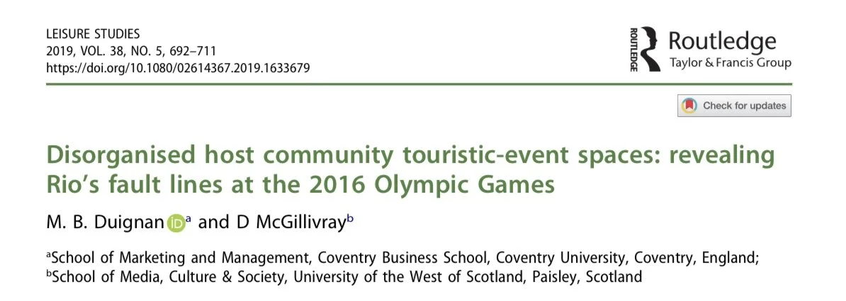 We investigate the live staging spatial-organisational requirements of the Rio 2016 Olympic Games, exploring the extent to which the project sequestrated, territorialised and commodified public space. Relatedly, we examine the role of new legal, regulatory and securitised event conditions in affording an effective and efficient ‘Olympic takeover’. We do this by drawing on i) official Rio 2016 planning documents, ii) obser- vations of the live Olympic-city spatial effects, and iii) interviews with key informants. Findings reveal that Rio’s specially created Olympic event zones sought to transform visitor flows and circulations across the city, appropriating and regulating public space in-line with a desired tourist aesthetic. Rio’s public civic space became reimagined and controlled for commercial exploitation by Olympic sponsors, supporters and suppliers– facilitated by the creation of areas of exclusivity. And yet, we also reveal how the Rio Olympic city simultaneously emerged disorganised, open and fluid in places– a (temporary) break in the (neoliberal) economic logic we have come to expect. We argue that localised conditions affecting Rio afforded closer connectivity between event visitor econo- mies and host communities. While these gains remain marginal and largely symbolic, they demonstrate that with effective planning, the Olympic host city need not only serve corporate interests.